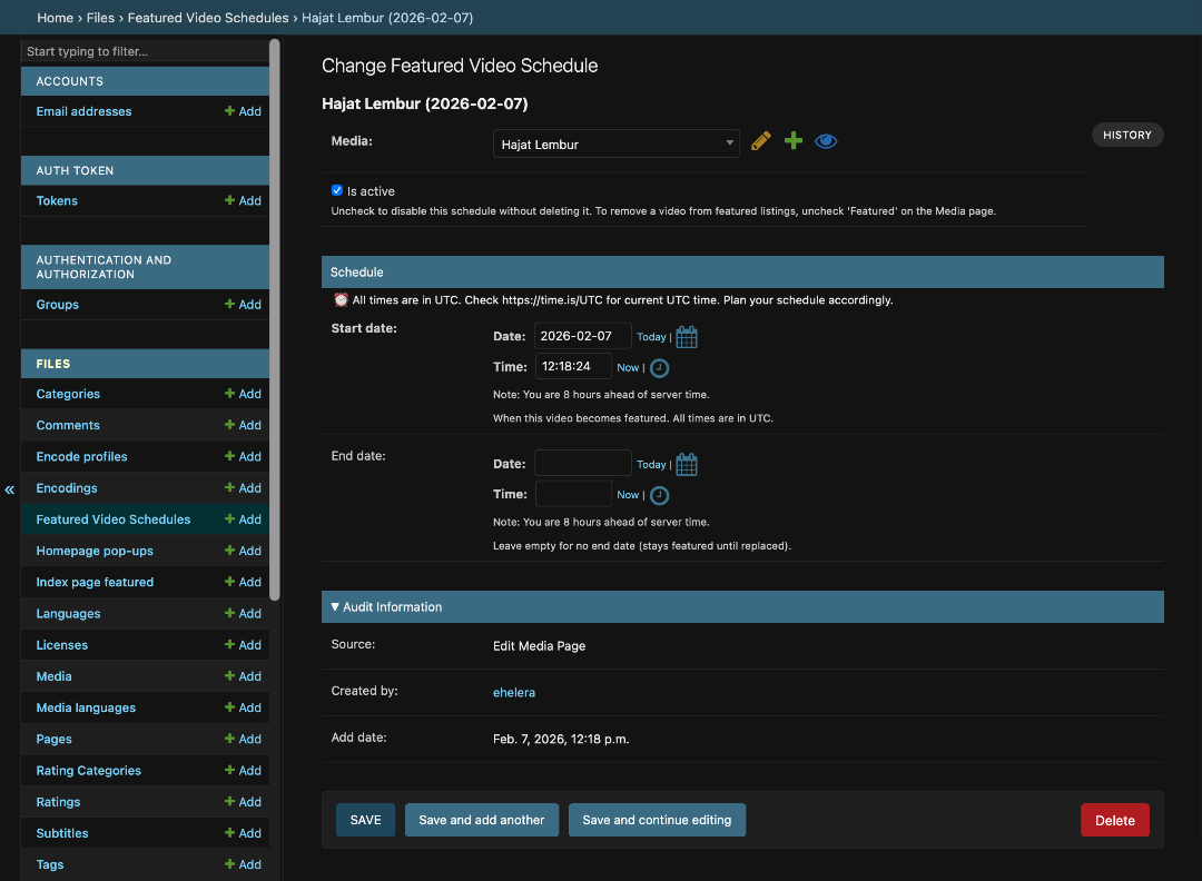 Administration page showing scheduled featured videos with date and time controls.